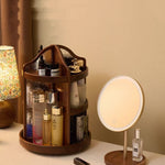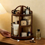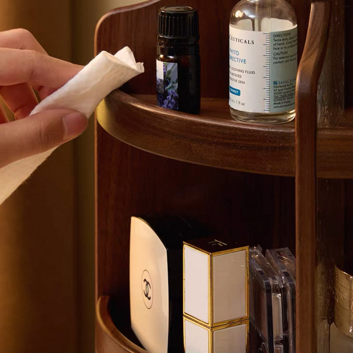 The Amora Solid Walnut Makeup Storage Cabinet Organizer (Multi-Layer Style) features a 360° rotating base and tiered compartments designed for skincare bottles, perfumes, creams, and makeup favorites — all visible, all easy to reach.