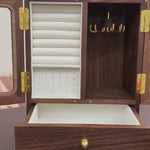 Öffnet man die beiden Türen, findet alles seinen Platz: Ringe in weichen Samtfächern, Ohrringe ordentlich präsentiert, Halsketten hängen knotenfrei, und eine untere Schublade bietet Platz für Uhren, Armbänder oder Erinnerungsstücke. Die Aufteilung ist schlicht, intuitiv und für den täglichen Gebrauch konzipiert.