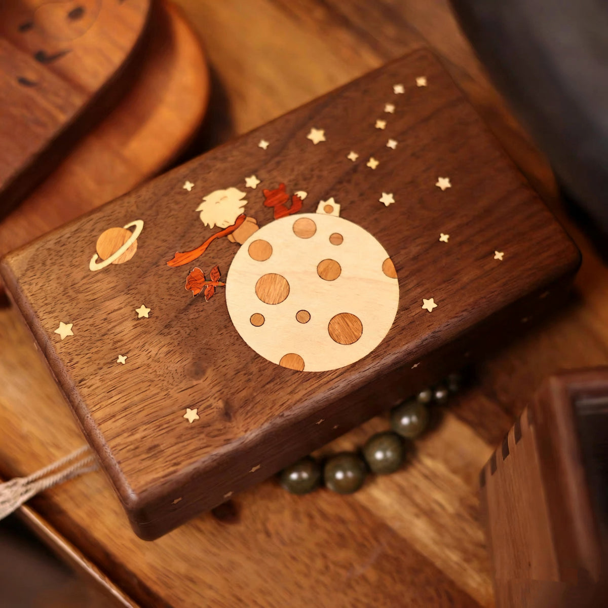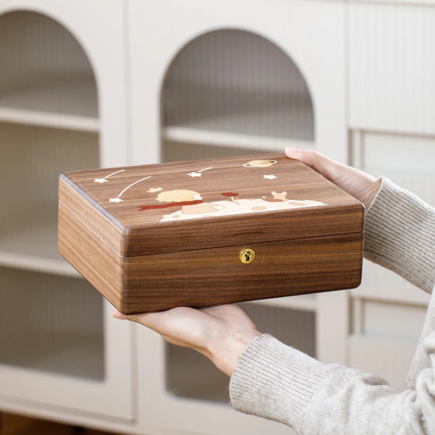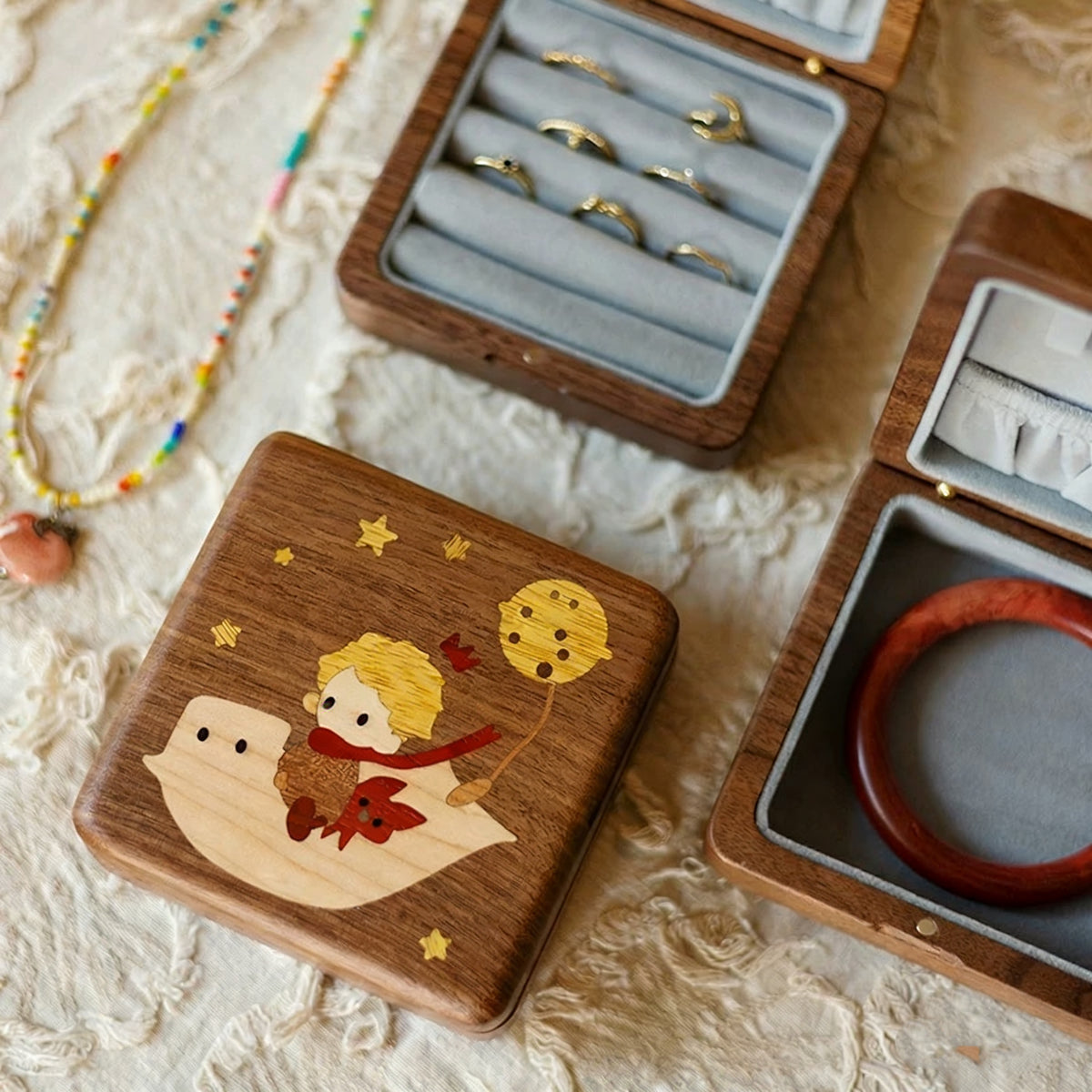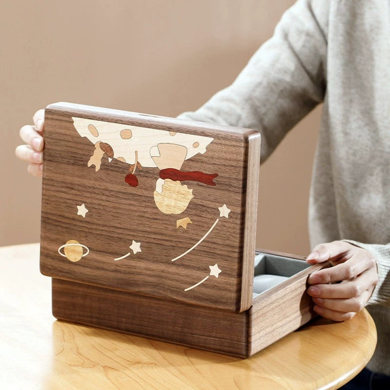 The Stellary Wooden Jewelry Box Collection is inspired by quiet, storybook moments — stars in the sky, little characters, and the gentle feeling of keeping something precious close.
