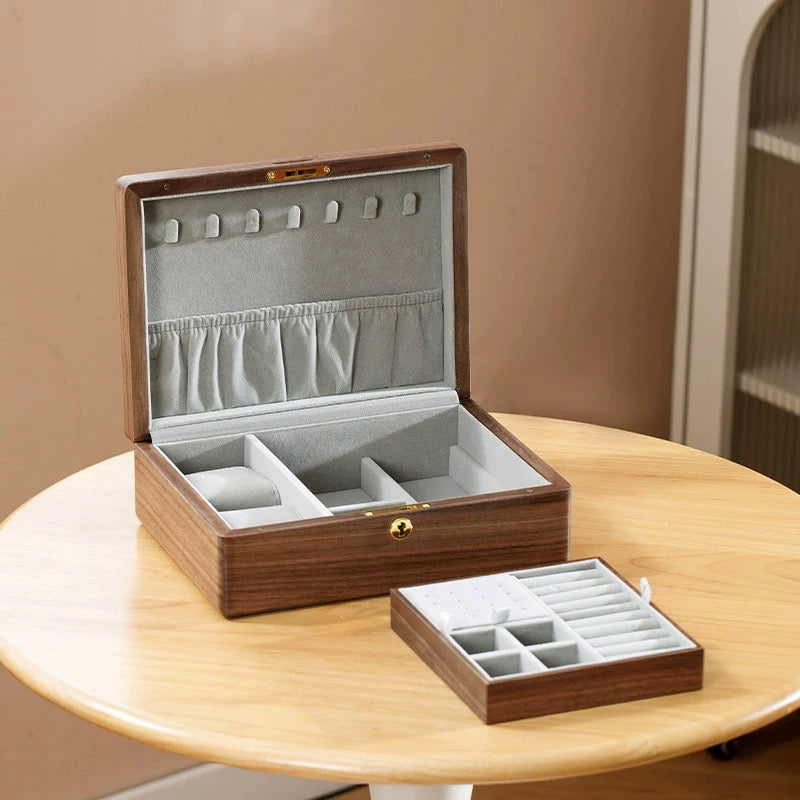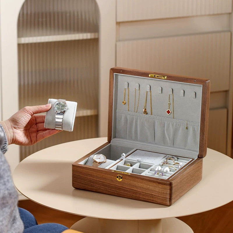 Crafted from solid wood with beautiful natural grain, each box feels warm and timeless. Inside, the soft velvet lining keeps your rings, earrings, necklaces, and small keepsakes safe from scratches, while the thoughtfully designed compartments make everyday organizing effortless.
