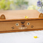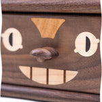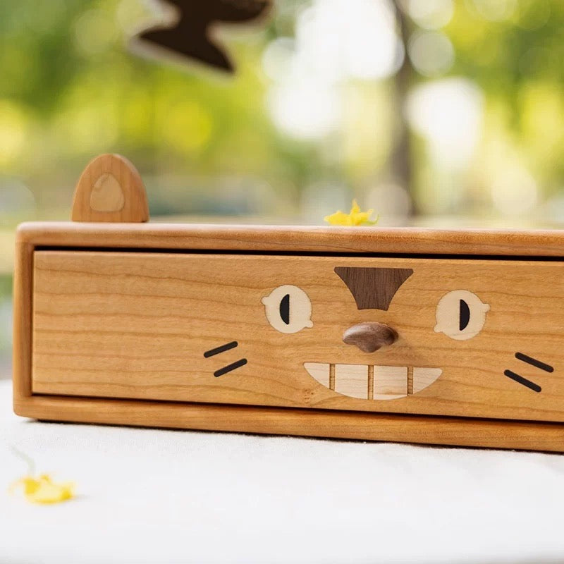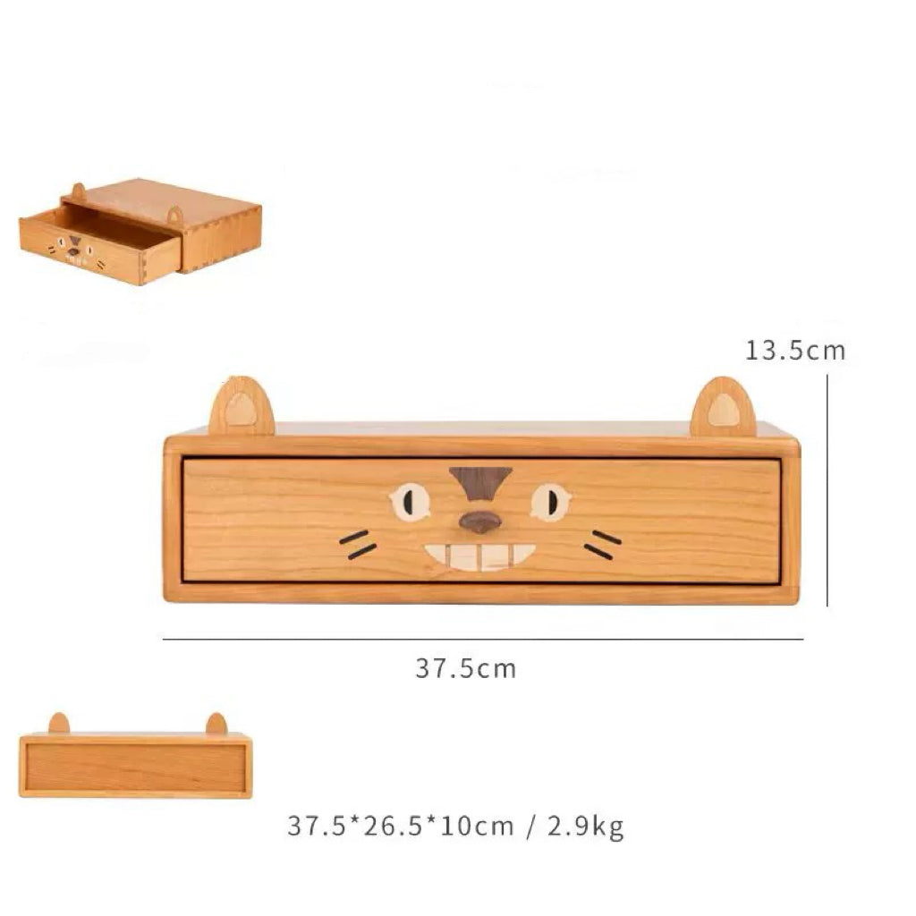 Die natürliche Maserung von Walnuss und Kirsche verleiht dem Möbelstück eine warme, rustikale Note, und das vom Toto-Motiv inspirierte Design ist einfach zuckersüß – mit den großen Augen, den flauschigen Ohren und dem freundlichen Lächeln. Jede Schublade bietet Platz für Kleinigkeiten wie Schmuck, Dekoartikel oder Büroutensilien. Schluss mit unordentlichen Schreibtischen – nur noch Ordnung und Niedlichkeit!
