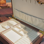 Aurelin est sculpté dans du noyer massif, sa surface lisse et apaisante évoquant un objet de décoration raffiné. À l'intérieur, un doux intérieur ivoire accueille vos bijoux précieux avec délicatesse. Colliers se logent élégamment sous le couvercle, montres trouvent leur place dans un compartiment rembourré, et le plateau inférieur, amovible et modulable, vous permet d'organiser bagues, boucles d'oreilles et petits souvenirs selon vos envies.