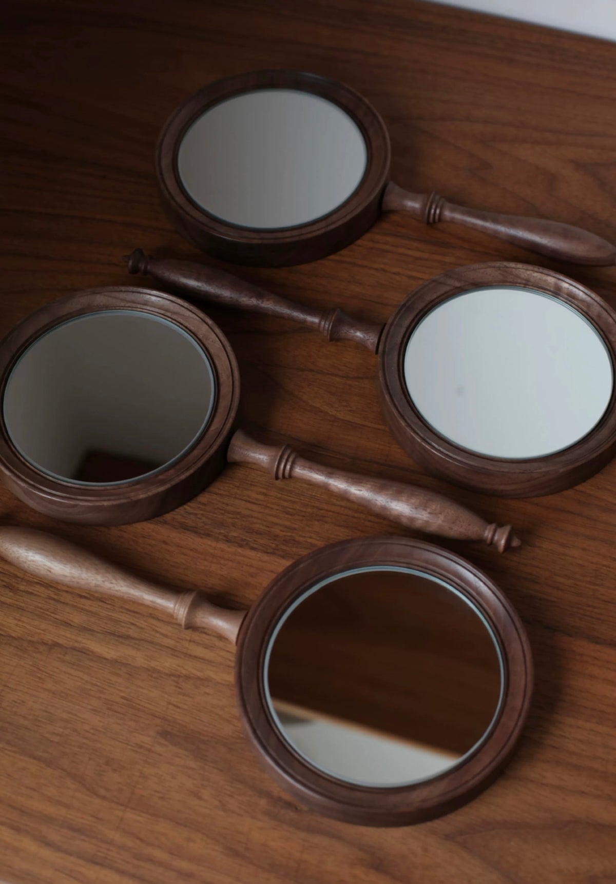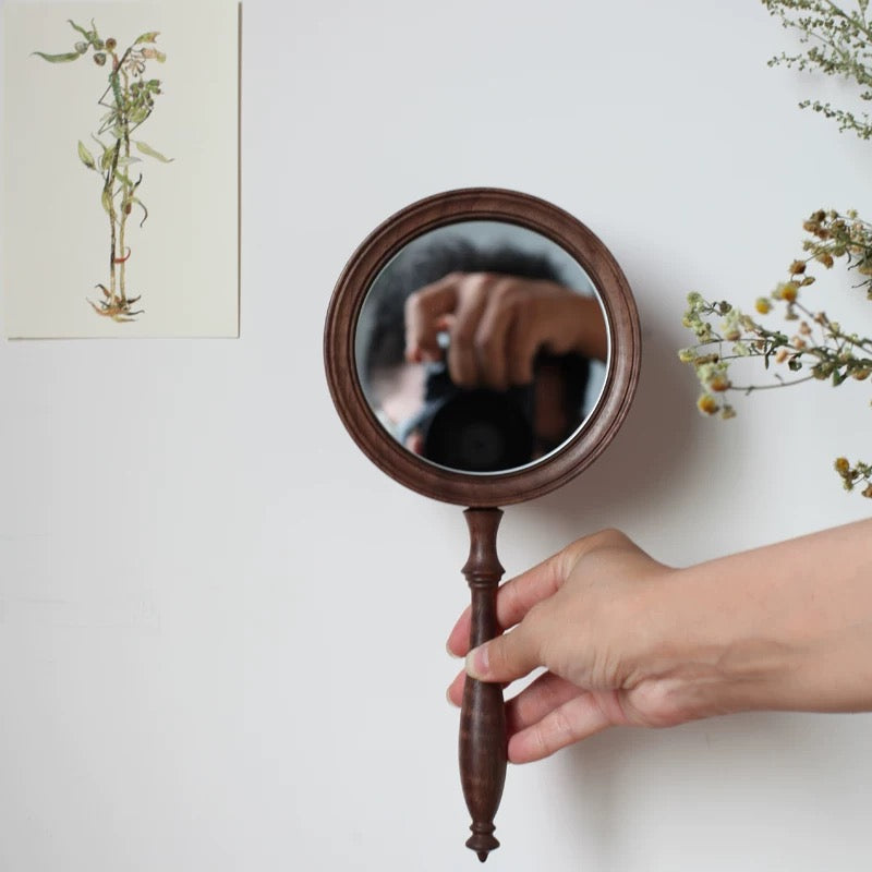 The solid - walnut frame, with its beautiful, unique wood grain, brings a touch of natural warmth. The round mirror sits perfectly in the carved walnut base—vintage charm meets daily practicality. Hold it to do your makeup or check your look; the smooth handle fits nicely in your hand.